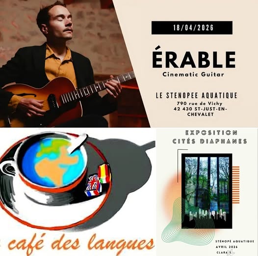 Cette semaine au STAQ :Bonjour à tou.te.s,Jeudi 16 avril : Attention : horaires décalés : ouverture du café à 11h. Dej, bibli, expoVendredi 17 avril 19h30 café-conversation en anglais avec Natacha. Tous publics, tous niveaux, prix libre. Sur inscription avant jeudi par mail : stenopeaquatique@gmail.comSamedi 18 avril 20h : Érable en concert au STAQ ! Début du concert 20h30. Prix libre, tous publics. Erable nous invite pour un grand bain sonore, nous offrant une musique sensible et délicate qui nous ramène à l'essence des petites choses. Une ode à la simplicité, la spontanéité, la poésie et l'émotion puisées dans le jazz, la folk et le rêve. Album Métamorphose sorti en Novembre 2024. Le voici à SAINT-JUST-EN-CHEVALETBandcamp : https://erablemusic.bandcamp.comYoutube : https://www.youtube.com/@erablemusic