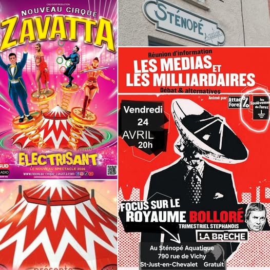 - Vendredi 24 avril 20h : réunion d'information et discussion avec les Soulèvements du Forez sur "Les médias et les milliardaires". Quelles conséquences pour demain ? Exemplaires du trimestriel La Brèche à découvrir. Dans le cadre du café flambeau sur liberté-pouvoir et vérité. Tous publics, gratuit, petite restauration sur place. Réservation conseillée par mail à stenopeaquatique@gmail.com
